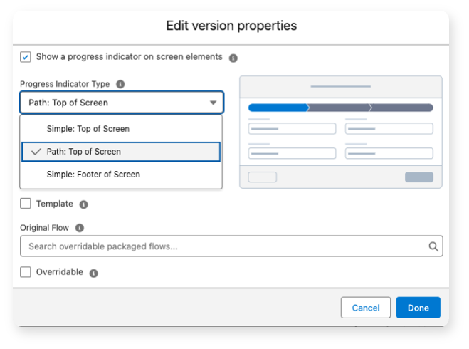 Progress indicators are automatically activated for flows created with the Spring ’25 release. Existing flows will maintain their previous configurations. To enable progress indicators for existing flows, follow these steps: