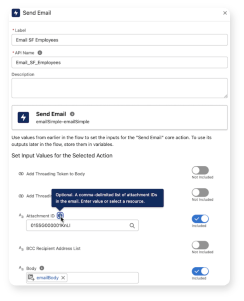 To address this need, the Spring ’25 release introduces the ability to send emails with attachments directly within a flow. This feature allows users to configure and attach files seamlessly, enhancing the versatility and functionality of automated communications. By leveraging this capability, users can ensure that all necessary documents accompany their emails, providing recipients with comprehensive information in a single, streamlined process. Whether sending invoices, reports, or personalized documents, this update simplifies workflow and enhances user productivity by automating the inclusion of relevant attachments.