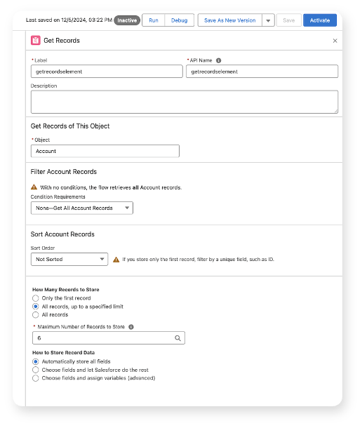 - Open the Flow Builder and locate the Get Records element you want to configure.